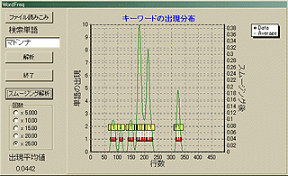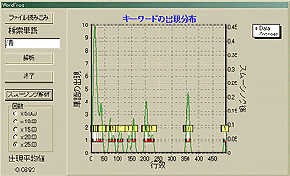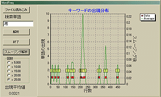 「スムージング解析」ボタンを押せば、その出現分布をスムージングした上で、1行辺りに「キーワード」がどの程度出現しているかを解析する。