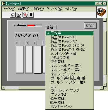 さて、使用した周波数は全て江尻氏の音律周波数表、音律について、音律実験 (http://www.tg.rim.or.jp/~ejiri/)に記載されていたセントから最初の音を440Hzとし、周波数に変換してある。