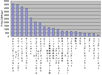 今回のグラフを見る限りにおいては、一位・二位が三位以降を引き離しているという感じではないし、富士通、NECが主催するインターネット接続サービスが活用されているという感じでもないようだ(少なくとも本WEBに関する限りは)。しかし、Sony主催のSo-netは活用されているようなのだ。
