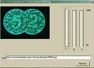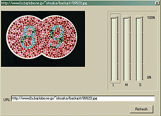 でやったL,M,Sの各錐体の感度が低いときの色覚シミュレーションを行うソフトを作成してみた。ソフトはこれである。前回と同じく、Susieプラグインを用いて画像を読み込んでいるので、「Susieの部屋」などから、Susie本体・あるいはプラグインを入手する必要がある。また、手間を惜しんだためProxy対応にはしていない。さて、動作画面サンプルを以下に示す。初期状態では
