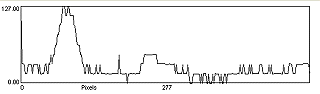それでは、次に「HIRAX一型分光器CCD+」で計測した波長毎の透過性を示してみよう。まずは、赤色フィルタである。赤色フィルタを使用している部分は、使用していない部分に比べて、赤色(そして赤外領域)以外の波長がカットされているのがわかる。