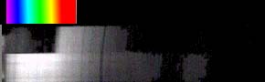 まずは、その分校計測出力例を示してみたい。下の写真は「CCDカメラで計測したスペクトルに、可視光の色対応を示すカラーバーを上に示したもの」である。これは前回と同じく、太陽光のスペクトルだ。水平軸が波長を示している。左が波長が短い領域であり、右が波長が長い領域である。可視光領域は左の1/3くらいの領域である。