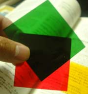 だから、赤色フィルタと緑色フィルタを重ねると、全然透けないわけだ。透過可能な波長領域がないワケである。こういうのを見ると、暗記用の赤色ペンと緑色下敷きの組み合わせを思い出してしまう。