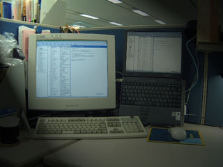 ところで、私の職場のデスクトップにはこんな風に二つの液晶画面が並んでいる。片方はデスクトップPCに繋がった普通の液晶ディスプレイで、もう片方はノートPCの液晶画面だ。結局、二つのPCの画面が並んでいるわけだけど、どこドアでキーボードとマウスを共有している。