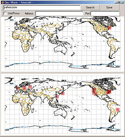 GeoWhois.exeの動作画面が次の図である。ドメインの場所を検索しその結果が上の方の画像に表示される。また、検索履歴が下の画像に表示される。検索履歴画像の方はSaveボタンでbmpファイルとして保存することができる。