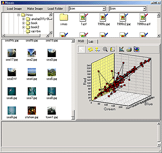 まずはローカルディスクの適当なフォルダに画像ファイルを保存しておく。そして、このMosaic(ニセモノ)でそのフォルダ内の画像を全部読み込んで、それらの各画像の色を調べるのである。本来は、それぞれの画像の特徴色(っていっても意味不明であるが)を抽出したりする方が良いのかもしれないが、今回は簡単のために各画像内で色味をテキトーに平均した結果を用いた。