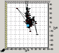 それが端的にわかるのがa*b*平面で表示させてみた場合である。a*方向すなわち赤色方向は多いのに対して、b*の小さい方向つまり緑方向などには妙に点がないことがわかるだろう。今のユニクロは緑を何故か避けているのである。緑の純色のフリースは人気がないのだろうか?う〜ん、不思議なところだ…