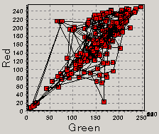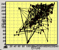 といっても、三次元のRGTB色空間を平面のグラフでこんな感じで眺めてみてもワケわからん状態なので、Red-Green平面、Red-Blue平面で眺めてみたのが次の二つの図である。