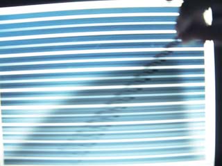 このアニメーションGIFや動画ファイルを再生して、部屋の電気を暗くしてみる。すると、CRTの画面というのはとても明るいので、部屋を暗くしてCRTだけをつけておくと、CRT画面に映し出されている色に部屋が染まる。部屋がそんな風にチカチカした状態で、画面の前で何かを振動させると、アラ不思議その物体の振動の様子が何やら変な風に見えてくる。例えば、真っ直ぐな細い棒を「Oscylinderscope風AVIファイルの前で棒を揺らしてみたところ」である。写真では判りにくいと思うが、真っ直ぐな棒がウニョロウニョロと曲がって見えるだろう。とにかく、真っ直ぐな棒が振動する様子を静止したイメージで目にすることができるのだ。