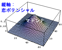 さて、これはこれまでも考え続けてきた「恋」の問題についても同じだろう。次の図に示すように「マドンナ」が一人しかいない状態では、その「マドンナ」の周りの「恋ポテンシャル」だけが高くなっている。