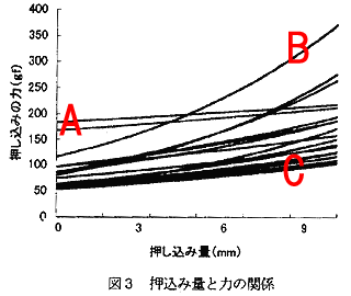 しかし、片やデータAやCのようにその程度押し込んだだけではまだまだ押し返す弾力が強くならない、言い換えれば懐の深さ(それを単に巨乳といってはイケナイ)を感じさせるものも存在するのである。このようなデータを眺めるとき、我々は何が何でも構造解析をしてみたい、と思うのは至極当然のことであろう。