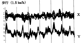 次に、歩く速さを変えたときの実測値と計算値を比較してみる。まずはゆっくり歩いた時のオッパイの振動のようすである。なお、実測値の方は水平方向と鉛直方向の揺れとが分離され表示されている。