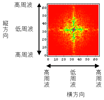 ![]() | 図の横・縦方向が実際の文字の横・縦方向に対応し、図の中で中央から外周方向に向かって低周波から高周波の成分の量を示している。強さは 小 ← 赤 黄 黄緑 青 紫 → 大の順番になっている。 たとえば、この漢字の例だと |