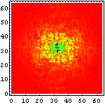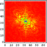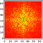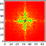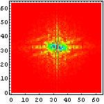 次に、それぞれの文字画像の複雑さの特徴を眺めるために、それぞれ二次元フーリエ変換をかけて、周波数空間に変換してみたものを示してみることにしよう。まずは、漢字の例を示して図の見方を説明してみたい。