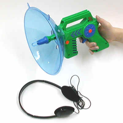 数日前に、その"Sonic Explorer"を見かけた時は出張帰りだったのだが、地下街の雑踏の中で「頭にヘッドホンを被り、ゴルゴ13のように集音ガンで狙っている」様子はさぞかしアブナイ奴に見えたに違いない。現に、私が雑踏の中に"SonicExplorer"で狙いをつけていたときには、一緒に出張していた仲間が二・三歩後ずさりして、私の側から離れていったくらいである。自分でも怪しい姿だとは思ったのだが、そんなことを忘れてしまうくらいに面白かったのである。こんなおもちゃみたいな外見に似合わないほど、これを使うと遠くの音がピンポイントでよく聞こえるのだ。地下街の雑踏の中で遥か向こうで携帯電話で話をしている人に"SonicExplorer"を向けると、私の耳元でささやいているかのように聞こえてくるのである。もちろん、遥か向こうといってもたかだか20mくらいではあるのだが、雑踏の先の20mというのはずいぶんと先に感じる。しかし、"SonicExplorer"の先のパラボラ面は見事にその遠く先の音を集めてくれる。