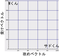 まずは、色々な人物(実際の人物であったり、小説などの登場人物であったり)のタイプを二次元空間に配置しよう。「この人は結構攻め役が合いそう」とか「この人は絶対受け役が合うのだー」という適性を