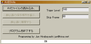 というわけで、作ってみたのがこのAVI2Stillsである。いつものように、テキトーに仕立て上げただけだ。下の図がAVI2Stillsの動作画面である。ちなみに、この画面中で、TrigerLebelは場面変化を検出する感度を示すパラメータで、多分60位が適当だと思う。そして、SkipFrameは動画ファイルの中を何フレーム毎に調べていくかを示すパラメータである。展開スピードが気にならなければ1でも構わない。