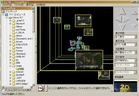 先日、「お笑いパソコン日誌」で3次元画像ブラウザ「みょう絵」というものを知った。画像ファイルを日付や色の特徴などで三次元空間に並べてみる、というソフトだ。下の図がその「みょう絵」の動作画面だけれど、こんな風に三次元空間に配置された画像が散らばる中を「みゅぃーん」と動く感覚が結構気持ち良い。