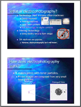 ところが、発表資料の背景にカラフルなものを使ってしまうと、例えば上のようなPowerPointの発表資料を使ってしまうと大変なことになる。配布用の資料を印刷している最中に、「○×色のインクがもうほとんどありません」とか「○×色のトナーを補充して下さい」といったメッセージをプリンターが表示するようになるのだ。つまり、あっという間にインクやトナーが無くなってしまうのである。単にそんなメッセージを表示するだけならばいいのだけれど、もちろんインクやトナーの補充をしてやらなければならない。しかも、そんな消耗品はとても高いのである。本体が15万円位で、消耗品も15万円位なんていうものだってあるくらいなので、つまりはお金に翼が生えて飛んでいってしまうのである。