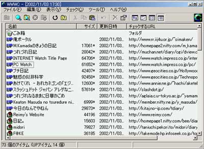 例えば、ワタシはWEBページを読みに行くときにはWebページの更新チェッカであるWWWCを使っている。その動作画面は下に示してみたような感じで、基本的に更新されたサイト名の羅列になる。また、例えばはてなアンテナのような同じような更新チェックアンテナの場合だって、基本的には更新サイトと更新内容がテキストで羅列・表示されることになる。