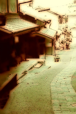 現代の街景色にシャープをかけ輪郭線を強調し、セピア風味にすることで郷愁感を出したもの。柔らかなソフトフォーカスもかかりつつも、芯のある写真ができあがる。