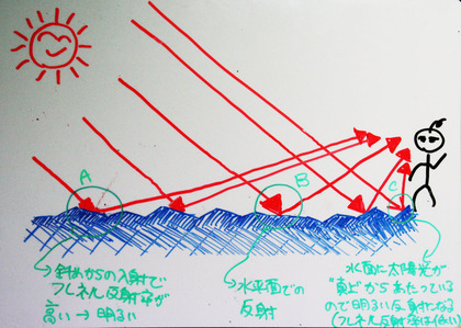 これらの効果が合わさった結果、太陽光の反射光が眩しく映り込むような箇所はどのようになるかを図示して考えてみると、「自分の足元の海面から太陽の方向へ延びる線上」となることがわかる。太陽と私たちを結ぶ線以外の方向は、海面での太陽光の反射率が低くなるので、太陽の姿はほとんど写らず、波立った海面に映り込む太陽の姿が見えるのは、自分の足先の海面から水平線まで光り輝く道状の領域ということになるのである。