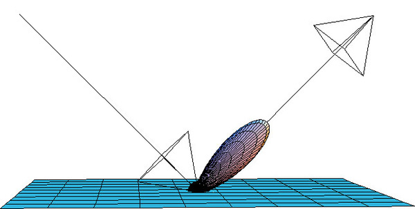 実際、表面が粗く波立った海面に太陽光が入射した時の反射光の分布を計算してみると、右の図のようになる(Modified - Blinn - Phong Model)。海面が微視的に色々な方向を向いているので、海面からの太陽光の反射は一方向のみに照射されるのでなく、色々な方向に向く。しかも、右の図は、まだ比較的表面が平らな場合の計算結果なので、実際の海面からの反射光はもっとさまざまな方向に広がる。