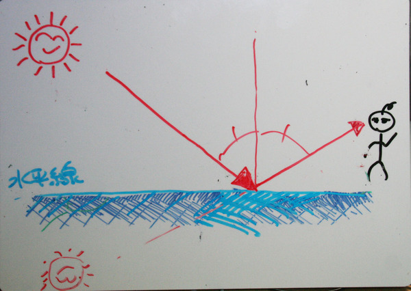 昔学校で習った理科の教科書の中には、確かこんな図が描いてあった。そして、太陽の光が水面で反射するときには、「入射角と反射角が同じになるように(海面からの太陽の反射光が)進む」ということだったように思う。そして、その結果、水面には上下さかさまになった太陽の姿が見える、はずだった。