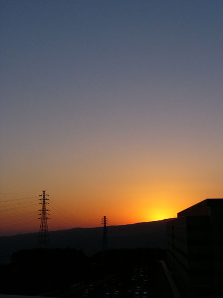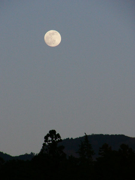 重厚で、それでいて色鮮やかな夕焼けが終わろうとする西の空。そして、東のひっそりとした青灰色の空からは白くて微かに黄色い月が出てきた。東の空と西の空、静と動、全く逆だ。なかなか、ゆったりとした時間と景色。