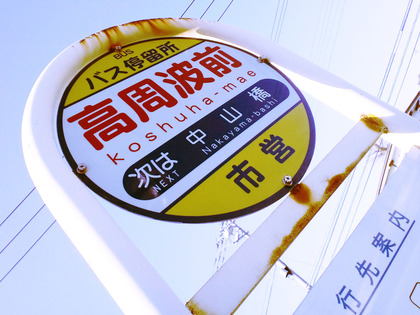 バスを降りると、そのバス停看板には「高周波前」と描かれていました。「高周波」ってどのくらいの周波数なんだ!?とか、高周波には「前」とか「後ろ」とかあるのか!?とか、そもそも、「なんで高周波前やねん!?」という「くだらないツッコミ」をひとり呟きつながら、バス停「高周波前」を記念写真に撮りました。それがこの写真です。一体、なぜ「高周波前」なんでしょう。何か変なデンパでも受信しているのでしょうか…?
