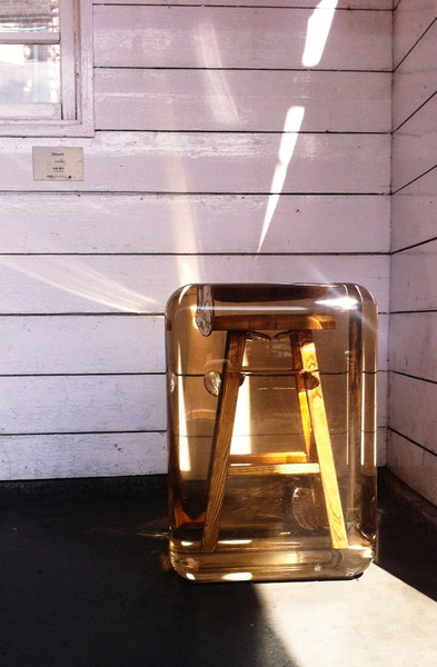 丸椅子を封じ込めた堅牢な透明樹脂、「触れない椅子」に太陽の光が当たれば、まるで大きなプリズムのように、白色光を細かく分け・駅舎を七色に輝やかせます。七色の光子を放つプリズムの上に座り、ホームに走り来る列車を眺めていれば、理系心と鉄心の両方が100パーセント満たされます。