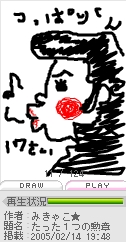 第三回に引き続き、第四回のらくがきボード展覧会です。みきゃこ★さんの見事ならくがきとか、ガリレオガリレイのアニメーション(これは再生して眺めてみましょう)とか、白川静(偽名)さんの漢字シリーズとか色々です。