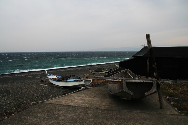 浜辺の防波堤を交差法の立体写真で眺めてみよう。真っ直ぐ続いていく防波堤の向こう、遠く先には原の向こうに富士の町が見える。左手には、浜辺の向こうに海が見える。左手奥には、浜辺の上に船が一隻小さく見える。