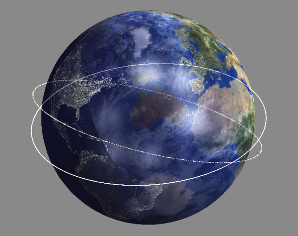 映画の中では某国が衛星破壊実験を行い、次々とデブリ被害が拡大してケスラーシンドローム(※)が起きているかのようなストーリーでした。(中略)90分ごとに次のデブリ襲来が起きると表現しているところ等はなかなかリアルです。この話が面白かったので、同じ高度で地球を回る物体軌道を描いてみたのが右下図です。約90分ほどで地球を1周する軌道だと、(その軌道が一致していない限りは)地球の裏側で45分後にまた出会ってしまいます。