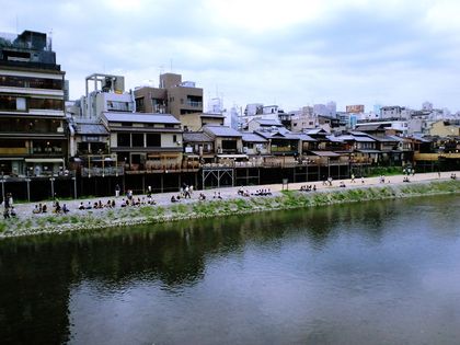 四条河原町に行く途中、久しぶりに鴨川の川辺に佇(たたず)む人たちに向けてシャッターを切りました。修学旅行生らしきグループ連れや家族連れも多いですが、もちろん”昼間は等間隔に座り、夜は隣のカップルとの間隔が照度に比例するように座る”「鴨川カップル」も水際にちらほら座っています。鴨川カップルたちは、、昭和の昔から、ずっと先の未来まで、同じ座り方をしているのかもしれません。