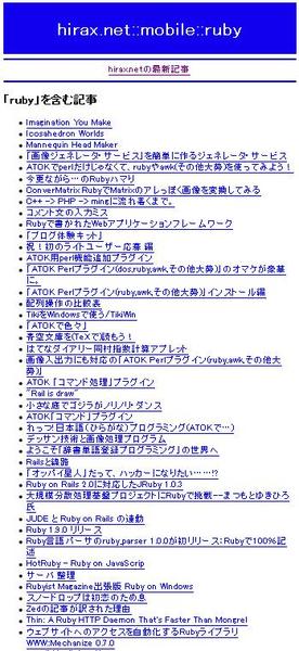 先日、携帯電話からhirax.netを眺めることができるようにしましたが(トップページ URL は http://www.hirax.net/mobile/latest で右上のQRコードがそのURLです)、関連記事表示やタグを含む記事の一覧表示といった機能を追加しました。ケータイから使う・読む分にはひとまず使いものになる・・・と良いなと思っています。