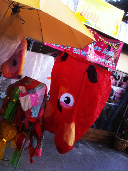そしてまた、ヘンだけど奇妙に可愛い(まるで熊本県PRマスコットキャラクターのくまもんみたいな)「顔模様」のコムファイが屋台にたくさん吊され並んでいたりします。こうした色モノ系キャラクタたちも、普通の伝統的コムファイやコムローイと同じように、希望や夢を積んで空に飛ばされていくのです。