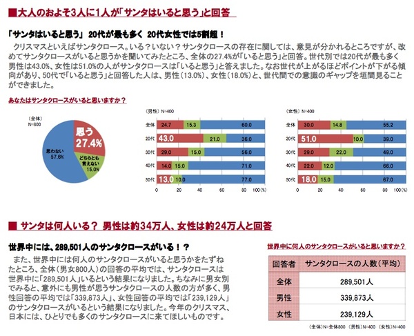 「大人」に対して、「サンタクロースはいると思うか?」「世界中に何人のサンタクロースがいると思うか?」という調査に関するニュースリリースを読みました(「クリスマスの過ごし方」に関連する調査)。その結果は、 サンタを信じる大人は3人に1人で、世界には289,500人のサンタがいる…と考えている、というものでした。