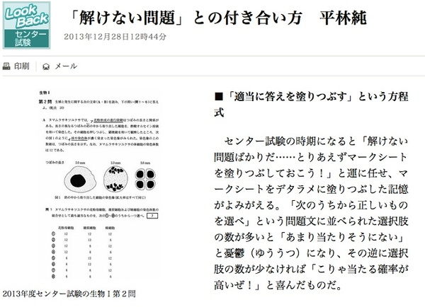 Asahi.com に「解けない問題」との付き合い方という記事を書きました。センター試験を間近に控えたこの時期に、センター試験を振り返り考える「Look Back センター試験」という続きもののひとつです。