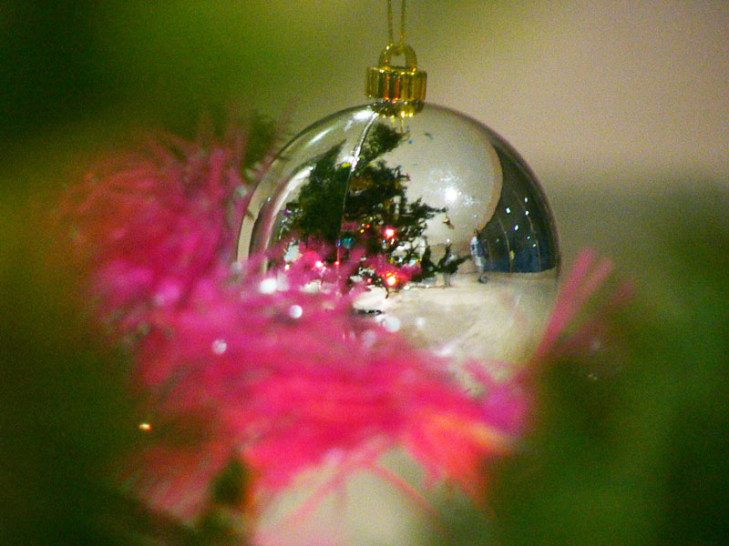 夜のエスカレーターホールの一番上にあるクリスマスツリー。金色のクリスマスプレゼントを指にとってみたり、銀の玉の向こうの世界を眺めてみたり。そんなことをしてる内にどうやらシャボン玉が降ってきたらしい。