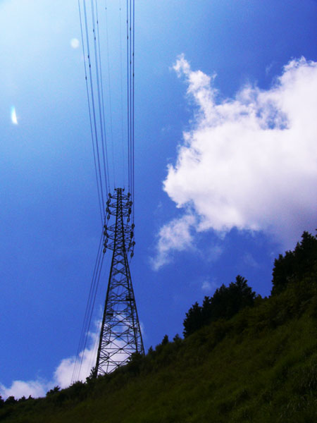 空に映える送電線、道ばたで生える花空に映える送電線、道ばたで生える花