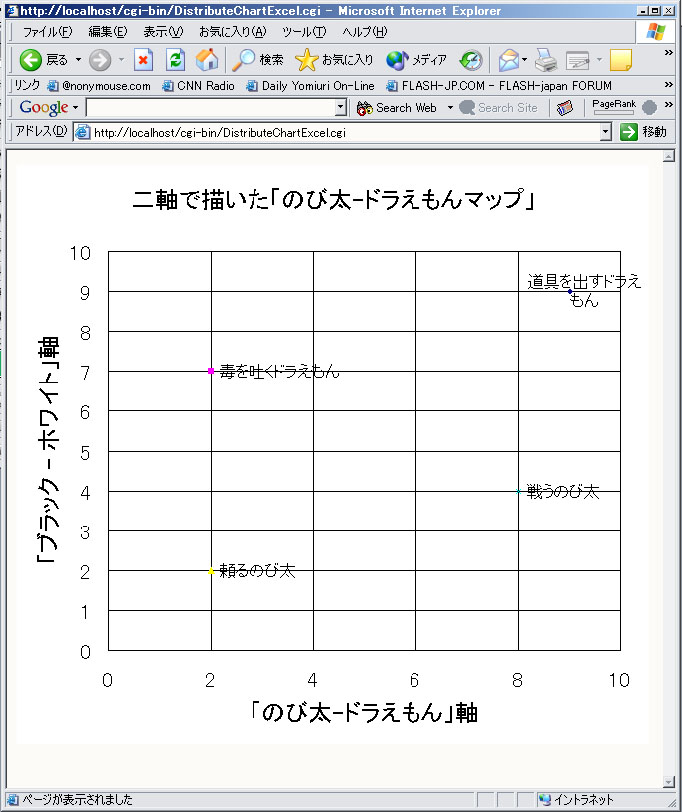 エクセルで円グラフCGIをいじって、エクセルで散布図グラフCGIを作ってみる。作ってはみたが、バックで動くのがExcel2003ならちゃんと動くのに、Excel2000では散布図の点にラベル文字が描かれない。ラベル文字を描く設定にしても、動作しないようだ。何とも、困ったものだ。