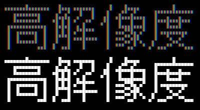 日本語文字はアルファベットに比べて非常に細かい。また、文字の特性上、縦方向の解像度が(横方向と同等以上に)高い必要もあり、ClearTypeのような技術はそれほど有効ではない。例えば、下に12pt.のSH G30-P・ARISAKA・MSゴシックで「高解像度」と表示したときの液晶の点灯状態(上列)と、それをグレースケール化したもの(下列)を示してみる。「デザインとして眺める画像」ではなく「文字」として読もうとする限りにおいては、ここで示したSH G30-PやARISAKAの(縦方向の)潰れは可読性を大きく損なってしまっていることがわかる。横線と横線の間がちゃんと空かずに中間調になってしまったり(読みやすさに必要なコントラストを得られなかったり)、それどころか隣り合った横線と横線がくっついてしまっていたりする。ClearTypeを適用するには、12pt.というサイズですら日本語の場合には(少なくとも縦に)細かすぎる。