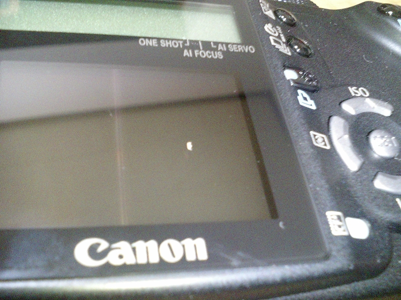 CANON EOS KISS Digital Nを買った。早速開封してみると…、おやおや?背面の液晶パネル内部に1x2mm程度の大きさの白いゴミが入っている。何だろう、これ?