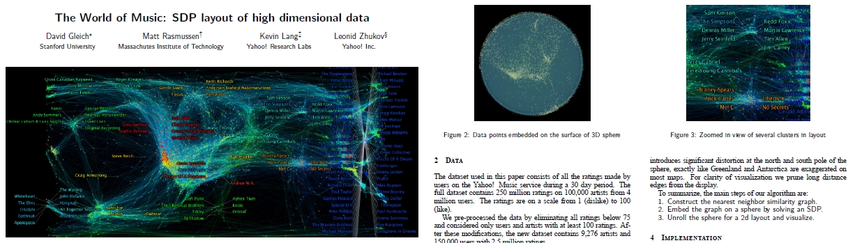 多次元空間で示されるミュージシャンの相関関係を二次元&三次元球として示した「ミュージシャン100,000人の相関図(PDF)」スタンフォード大学・マサチューセッツ工科大学・Yahoo!の人たちによる研究結果。 via メディア・パブ