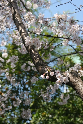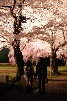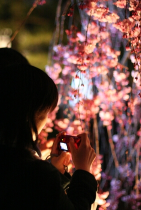 紅天女が出てきそうな風景だ。と、一瞬思うが「ガラスの仮面」の紅天女は梅の木だったことにしばらくして気づく。ほとんど全ての人が、デジタルカメラかカメラ付き携帯電話で夜桜を撮っている。携帯電話を両手で携えて桜に向かっている人たちは、まるで何かのお祈りをしているかのよう。