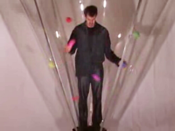 透明な円錐を逆さに立てて、その中に入り込む。つまり、透明な漏斗の中に入り込んで、ボールを転がしジャグリングをする、というビデオ"Conic - Juggling in a Cone (Preview)" なんだか、人間が原子の世界の中に入り込んでしまったような、そんな感覚になるビデオ。
