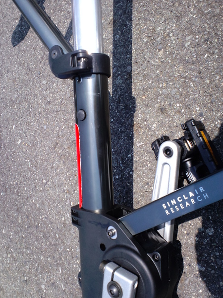さて、一緒に折りたたまれた状態から組み上げてみた。…すると、なんとコロッと音を立てて、ネジが一本落ちた。ネジが落ちた源を捜してみると、なんと、純正A-bikeのシートを支えるネジだった。ここら辺から、少し「純正A-bike」に不安を抱えながら、「純正A-bike」と「8インチ空気タイヤ版 A-bicycle」を乗り比べてみると、比べようもないほどにニセモノの方が遥かに安定していて、安心して自転車に乗り・走らせることができることに驚かされた。