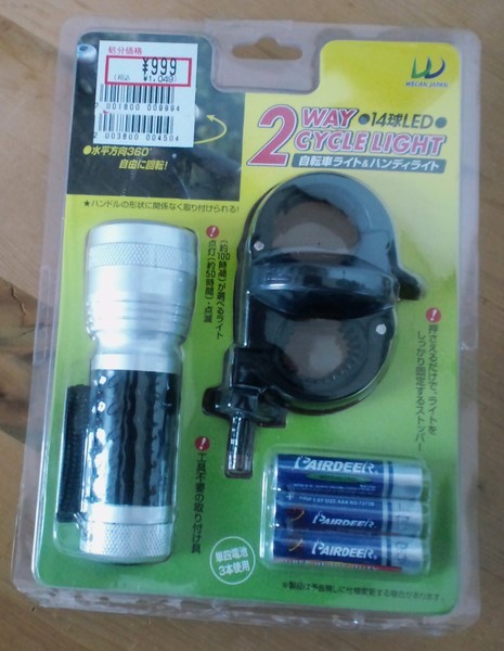 そこで、いちばん最初に行った100円ショップは"レモン"である。ここで、「電池(単三電池×4本)式の自転車用のライト」を買った。この段階、ライト本体にまずは100円玉を1枚払った。ライトの本体は大きいし防水性もないが、100円玉1枚で買うことができるというのは大きい。