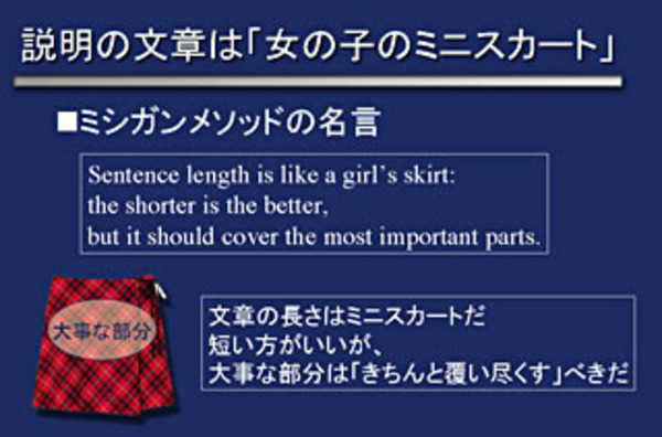 その時に使ったスライドの一つを、右に貼り付けてみました。このスライドに書かれている文章は、"Sentence length is like a girl's skirt: the shorter the better, but it should cover the most important parts."というミシガン・メソッド(ミシガン大学で開発された言語教習の流儀)からひろまったと伝えられている名言です。 日本語に訳すと、「 文の長さは女性のミニ・スカートのようなもので、短ければ短いほど良い。しかし、最も大切な部分はカバーしていなければならない」ということになります。素晴らしく的確な言葉です。